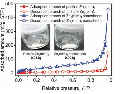 該研究在使用Zn2(bim)4制備Zn2(bim)4分子篩納米片(以下簡(jiǎn)稱納米片)時(shí),使用Autosorb氣體吸附分析儀分別測(cè)試了Zn2(bim)4與納米片的N2(77K)吸脫附等溫線。結(jié)果表明納米片的BET比表面積(112.4 m2/g)遠(yuǎn)高于Zn2(bim)4(19.9 m2/g),并且納米片的吸脫附等溫線屬于IUPAC分級(jí)的Type-II型吸附等溫線、H4類脫附回滯環(huán),這說明了材料中存在納米片堆積產(chǎn)生的狹縫形裂隙孔。
