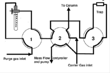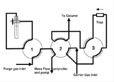 動(dòng)態(tài)頂空常用的方法是吹掃捕集技術(shù),吹掃-捕集實(shí)質(zhì)上是一種連續(xù)氣體萃取技術(shù),吹掃氣(一般使用氮?dú)?通過液體或固體樣品,將樣品中的可揮發(fā)組分(其中包括欲測組分)帶出,然后用冷凍或固體吸附劑吸附的方法,將欲測組分捕集下來,再通過熱解吸的方法,將欲測組分解吸下來,進(jìn)行分析。