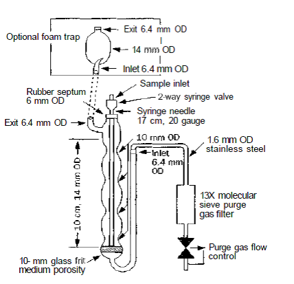 (1)玻璃吹掃裝置可具有容納5 mL 或25 mL樣品, 當(dāng)檢測的靈敏度能以達(dá)到方法的檢測限時(shí),使用5 mL 的吹掃裝置, 應(yīng)盡量減少樣品上方氣體空間,減少死體積的影響, 吹掃瓶底部有一玻璃砂芯, 它使吹掃氣成為分散細(xì)微的氣泡通過水樣, 并使吹掃氣從距水樣底部5 mm 處引入, 初始?xì)馀葜睆綉?yīng)<3 mm , 吹掃裝置也可使用針型噴口。
