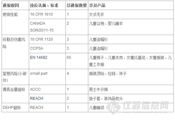 2014年12月,中國紡織及鞋類產(chǎn)品出口歐盟、美國、加拿大、澳洲被召回的共有82例,其中與中國相關(guān)的共有52例。主要涉及兒童服裝拉繩安全問題;兒童服裝燙鉆、拉鏈等小部件脫落安全問題;女式毛衣可燃性安全問題;男士牛仔褲、墊子套及裝飾品枕頭偶氮含量超標(biāo)問題以及兒童睡袋DEHP超標(biāo)問題。