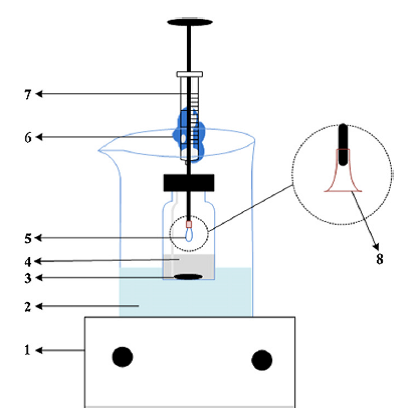 1— 電磁攪拌器 2—水 3--電磁攪拌棒 4—樣品溶液 5—液滴