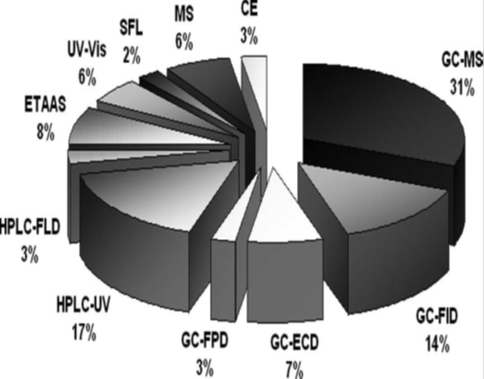 與HS-SDME配合進(jìn)行最后分析的技術(shù)主要是氣相色譜儀,占到到過(guò)75%,而使用HPLC配合HS-SDME的只有不到10%,原子吸收光度分析的占5%,用毛細(xì)管電泳分析的占3.5%。
