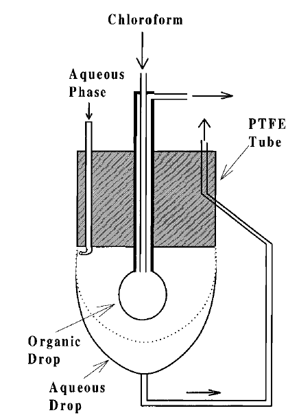 單液滴微萃取(single drop microextraction,SDME)類似于SPME,只是把萃取絲換成一滴有機(jī)溶劑液滴(懸于注射針頭或毛細(xì)管口)。用單滴溶劑作為用液體吸著分析物在分析化學(xué)中的應(yīng)用可以追溯到上世紀(jì)90年代中期的Dasgupta的工作,Dasgupta 研究組在1995年首次開(kāi)發(fā)了用單滴液體作為吸著氣體的界面來(lái)萃取空氣中的氨和二氧化硫等氣體( Anal Chem 1996,68:1817-1882),用石英毛細(xì)管口的水滴作吸著劑來(lái)收集被分析物,然后用在線光度法進(jìn)行測(cè)定。1996年們又用滴中滴(水滴包圍有機(jī)溶劑液滴)小型化溶劑萃取系統(tǒng),他們把十二烷基硫酸鈉和亞甲基藍(lán)作為離子對(duì)萃取到氯仿液滴中,如圖1所示 。他們利用一個(gè)蠕動(dòng)泵把萃取后的液滴排除,用光纖檢測(cè)器進(jìn)行光度分析。