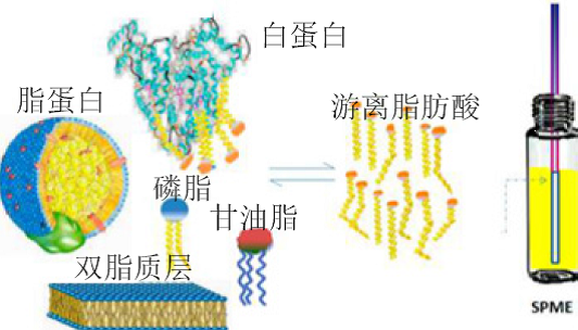 SPME 的魅力在于它可以進行活體樣品中萃取分析物,用于代謝組學(xué)和脂質(zhì)組學(xué)的研究,對這一課題SPME的發(fā)明人 Pawliszyn 近年進行了闡述(Angew Chem, 2013, 125:12346 –12348;Anal Chem, 2014, 86:12022−12029)。分析脂質(zhì)代謝產(chǎn)物中游離脂肪酸的示意圖如下。