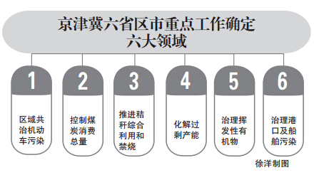 京津冀及周邊地區(qū)大氣污染防治協(xié)作小組第四次會(huì)議近日通過(guò)了《京津冀及周邊地區(qū)大氣污染聯(lián)防聯(lián)控2015年重點(diǎn)工作》(以下簡(jiǎn)稱《重點(diǎn)工作》),明確表示京、津、冀、晉、魯、內(nèi)蒙古六省區(qū)市將在機(jī)動(dòng)車(chē)污染治理、煤炭消費(fèi)總量控制、秸稈綜合利用和禁燒、化解過(guò)剩產(chǎn)能、揮發(fā)性有機(jī)物治理、港口及船舶污染治理六大重點(diǎn)領(lǐng)域協(xié)同開(kāi)展工作。