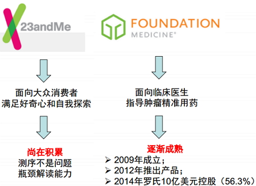 Foundation Medicine(NASQ:FMI)自2009年成立后在短短3年內(nèi)就推出檢測(cè)產(chǎn)品,至2014年底已收集檢測(cè)的35,000個(gè)臨床腫瘤樣品,并進(jìn)行了大量癌癥相關(guān)基因的測(cè)序,突變數(shù)據(jù)分析,臨床信息、藥物信息關(guān)聯(lián)研究,形成大數(shù)據(jù)庫(kù);根據(jù)檢測(cè)和分析結(jié)果,給病人提供個(gè)性化治療方案并收集療效信息。
