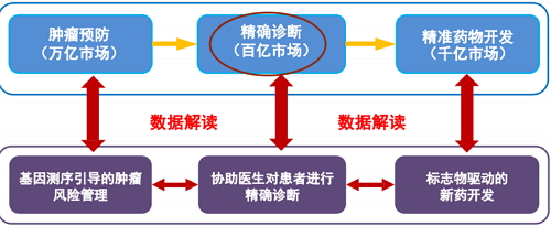 在演講過程中,胡博士還表示,以腫瘤診療為例,通過分析基因測(cè)序和大數(shù)據(jù)分析帶來了巨大的市場(chǎng)機(jī)會(huì):以基因測(cè)序引導(dǎo)的腫瘤風(fēng)險(xiǎn)管理將形成萬億級(jí)別的腫瘤預(yù)防市場(chǎng);協(xié)助醫(yī)生對(duì)患者進(jìn)行精準(zhǔn)診斷將形成百億級(jí)別的精確診斷市場(chǎng);以標(biāo)志物驅(qū)動(dòng)的新藥研發(fā)將形成千億級(jí)別的精準(zhǔn)藥物開發(fā)市場(chǎng)。