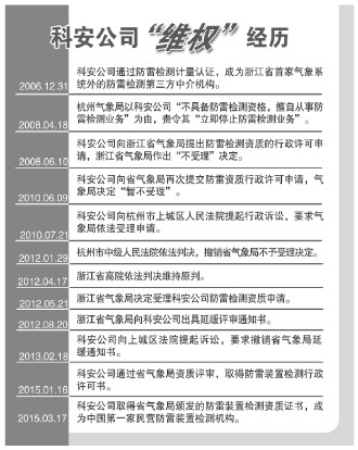 科安公司為了申請防雷檢測資質,曾與氣象部門“叫板”了五年,多次起訴氣象局并獲得勝訴。2014年,這家公司終于獲得浙江省氣象局授權許可的丙級資質,成為唯一一家民營性質從事防雷裝置檢測工作的中介機構。