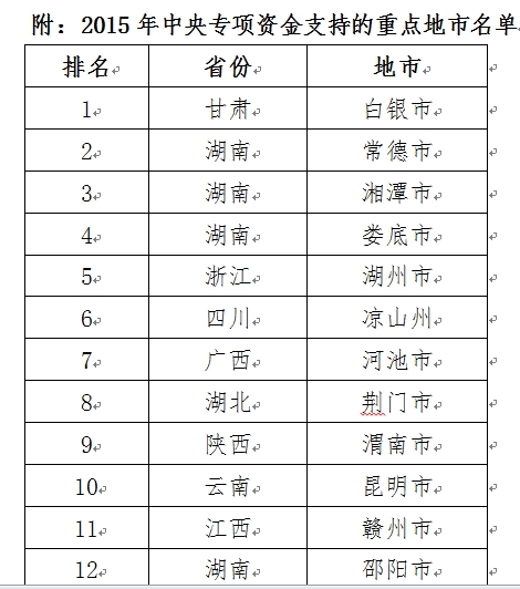 通過初步審查和現(xiàn)場競爭評審,考察了申報區(qū)域污染治理的緊迫性、方案的合理性、基礎(chǔ)工作條件、保障措施等,財政部、環(huán)境保護部確定對綜合排名前30位的地市(下轄38個重點區(qū)域)予以支持。支持名單于6月1-5日在財政部網(wǎng)站上進行了公示。中央資金將連續(xù)三年對重點區(qū)域進行支持,其中2015年下達資金279315萬元,用于加快推進重金屬污染綜合防治。同時,根據(jù)2014年度《規(guī)劃》實施考核結(jié)果,對存在突出問題的地市,資金安排按一定比例予以扣減。