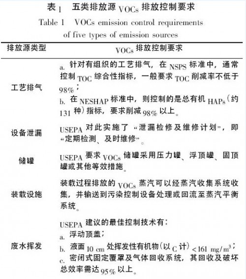 常規(guī)污染物包括PM、CO、O3、SO2、NOx、Pb、有機(jī)物(VOCs)、酸性氣體(氟化物、HCl)等。我國(guó)暫未把揮發(fā)性有機(jī)物(VOCs)列為常規(guī)污染物進(jìn)行控制。而美國(guó)為控制光化學(xué)煙霧和臭氧層破壞等環(huán)境問(wèn)題,對(duì)VOCs的排放作了詳細(xì)的規(guī)定。首先,涉及這類污染物的行業(yè)都制訂有行業(yè)排放標(biāo)準(zhǔn),包括煉油、石化、精細(xì)化工(殺蟲(chóng)劑、涂料、染料顏料等雜項(xiàng)有機(jī)化學(xué)品)、油品儲(chǔ)運(yùn)、制藥、表面涂裝、出版印刷、鑄造、服裝干洗等。在排放標(biāo)準(zhǔn)中又根據(jù)排放源類型的不同,分工藝排氣、設(shè)備泄漏、廢水揮發(fā)、儲(chǔ)罐、裝載操作五類源,分別規(guī)定了排放限值、工藝設(shè)備和運(yùn)行維護(hù)要求,具體見(jiàn)表1。