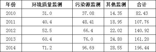 2010-2014年中國環(huán)境監(jiān)測細分市場規(guī)模(單位:億元)