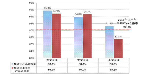 (二)2015年上半年,共抽查了2449家企業(yè)生產(chǎn)的2476批次產(chǎn)品,檢出237批次產(chǎn)品不合格,不合格產(chǎn)品檢出率為9.6%,從抽查情況看,產(chǎn)品抽查合格率為90.4%,與近三年整體情況對(duì)比,呈現(xiàn)波動(dòng)上升態(tài)勢;與2014年國家監(jiān)督抽查合格率相比,降低了1.9個(gè)百分點(diǎn)。