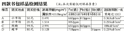 近日,記者在超市、小商品市場(chǎng)及購(gòu)物網(wǎng)站購(gòu)買(mǎi)了4款不同價(jià)位的書(shū)包,送至一家紡織品實(shí)驗(yàn)室進(jìn)行游離甲醛、重金屬、反光性能的檢測(cè),發(fā)現(xiàn)4款書(shū)包游離甲醛均不同程度超標(biāo),其中兩種書(shū)包中測(cè)出重金屬鉛,同時(shí),4款書(shū)包里僅1款有反光材質(zhì)。