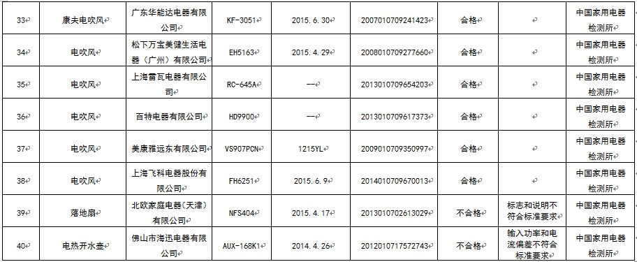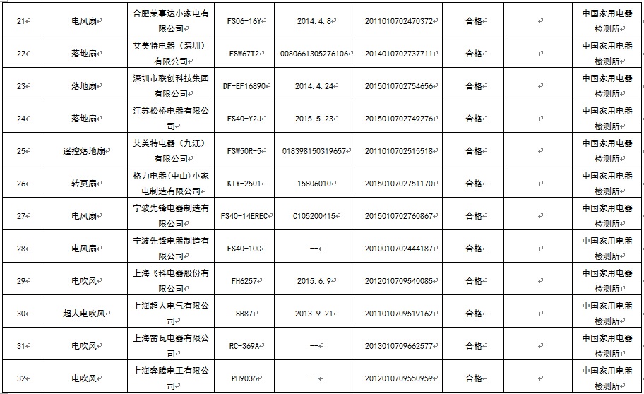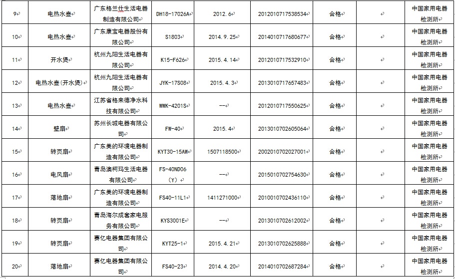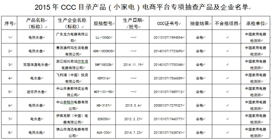 11月10日,國(guó)家認(rèn)監(jiān)委公布了2015年度電商平臺(tái)CCC產(chǎn)品抽查結(jié)果。經(jīng)檢測(cè),抽查的40個(gè)批次產(chǎn)品中,其中38個(gè)批次產(chǎn)品合格,2個(gè)批次產(chǎn)品不合格,分別為電熱水壺、電風(fēng)扇(具體產(chǎn)品型號(hào)及生產(chǎn)廠家詳見附件),不合格原因分別為輸出功率偏差、標(biāo)志說(shuō)明不符合標(biāo)準(zhǔn)要求。