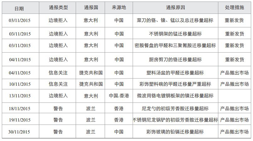 2015年11月歐盟食品及飼料快速預(yù)警系統(tǒng)(RASFF)共對華通報食品接觸材料類產(chǎn)品抽檢不合格案例10起。通報國成員有捷克共和國、意大利、 波蘭。其中,餐廚具仍然為主要被通報的產(chǎn)品類型。本月被通報的產(chǎn)品主要是甲醛、初級芳香胺、鉻、錳、鎳等的遷移量超標(biāo)。CTI建議相關(guān)生產(chǎn)企業(yè)引起重視, CTI華測可以為您提供食品接觸類材料成型品及原材料的檢測服務(wù)。
