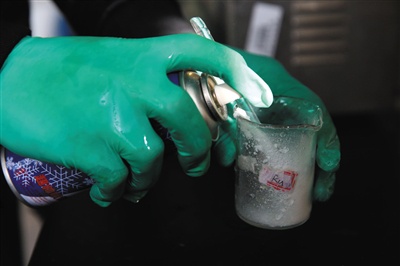 12月17日,實(shí)驗(yàn)室工作人員將圣誕噴雪噴入燒杯中,準(zhǔn)備檢測(cè)重金屬含量。