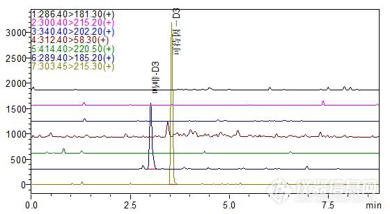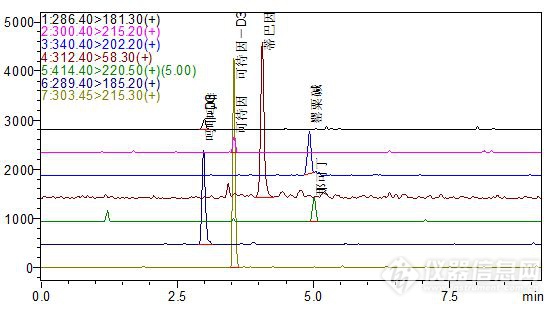 使用島津液相色譜與三重四極桿聯(lián)用系統(tǒng)(LCMS-8030),采用多反應(yīng)監(jiān)測(cè)模式,有效排除基質(zhì)干擾,分析時(shí)間只需8.8 min。