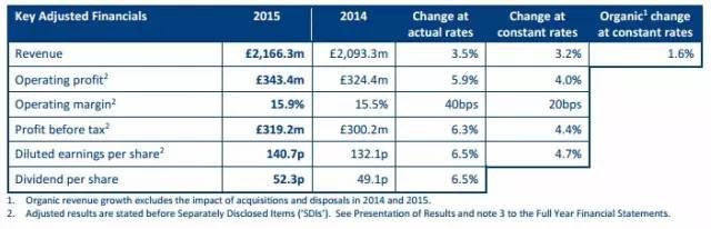 天祥集團(tuán)(Intertek)2015年年報顯示,2015年全年總營業(yè)收入為21.66億英鎊,增長3.5%。業(yè)績總體情況及各部分營業(yè)收入如下: