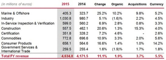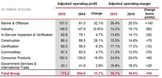 必維國際檢驗集團(tuán)2015年年報顯示,BV 2015 年總營收達(dá)到 46 億歐元,增長 11.1%;調(diào)整后營業(yè)利潤達(dá) 7.75 億歐元,增長 11.7%。各部分營業(yè)情況如下: