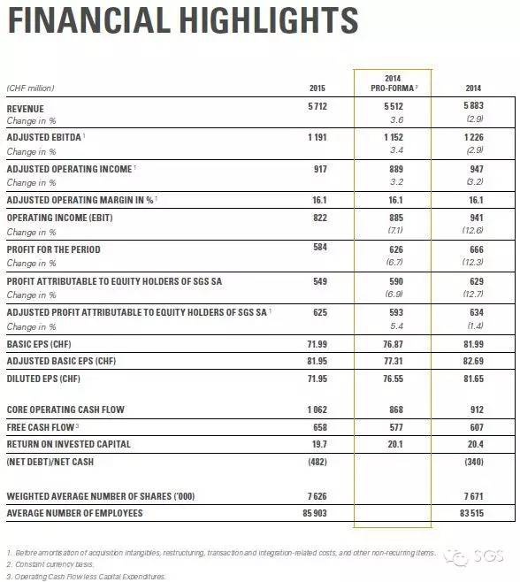近日,SGS集團(tuán)發(fā)布《2015全年報》,數(shù)據(jù)顯示:2015年度,SGS集團(tuán)實現(xiàn)總營收57.12億瑞士法郎,按固定匯率計算,同比增長3.6%,有機營收增長率2.0%。調(diào)整后息稅前利潤達(dá)11.91億瑞士法郎,同比增長3.4%。調(diào)整后營業(yè)利潤率為16.1%,與2014年保持一致。全年營運現(xiàn)金流提升明顯,歷史上第一次,SGS核心營運現(xiàn)金流超過10億瑞士法郎。