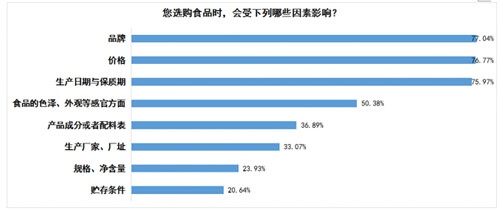 調(diào)查發(fā)現(xiàn),消費者在選購食品時,受品牌、價格的影響最大,分別有77.04%和76.77%的被調(diào)查者會受到這兩個因素的影響。這要求企業(yè)在給消費者更多實惠的同時,要像愛護自己的羽毛一樣呵護品牌形象。另外,因為食品的特殊屬性,75.97%的被調(diào)查者表示食品的生產(chǎn)日期與保質(zhì)期也是影響他們選擇的一個重要因素。但近半消費者對食品的色澤、外觀等感官方面并不敏感,六成多消費者沒受到產(chǎn)品成份、生產(chǎn)廠家的影響。這也提醒部分消費者,在選購食品時,還應(yīng)多關(guān)注食品的色澤、外觀及產(chǎn)品成分、生產(chǎn)廠家等因素。