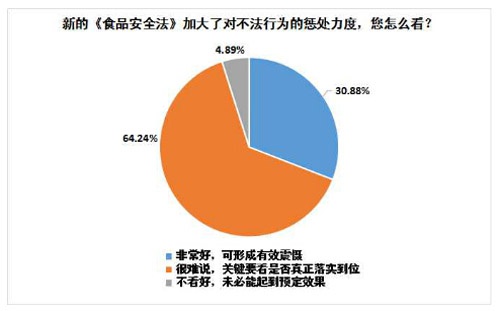 對于新的《食品安全法》加大了對不法行為的懲處力度這一舉措,消費者又是怎么看呢?調(diào)查顯示,64.24%的消費者表示效果很難說,關(guān)鍵要看是否真正落實到位;30.88%的消費者表示非常好,可形成有效震懾;僅有4.89%的消費者持否定態(tài)度,表示這一舉措未必能起到預(yù)定效果。這顯示了消費者對新的《食品安全法》落實情況的擔憂。