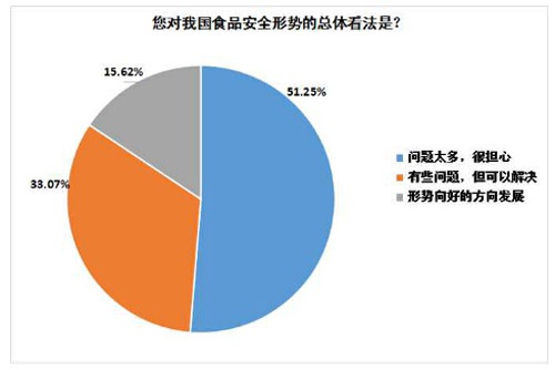 在對我國食品安全形勢的總體看法方面,51.25%的消費者持悲觀態(tài)度,認為問題很多,并表示擔憂;33.07%的消費者則持相對樂觀的態(tài)度,表示“有些問題,但可以解決”;還有15.62%的消費者更為積極樂觀,認為形勢正在往好的方向發(fā)展。從消費者的態(tài)度看出,我國食品安全確實存在諸多問題,令部分消費者非常擔憂,但相關(guān)部門改善現(xiàn)狀的努力,已使不少數(shù)消費者感受到了政府的決心。