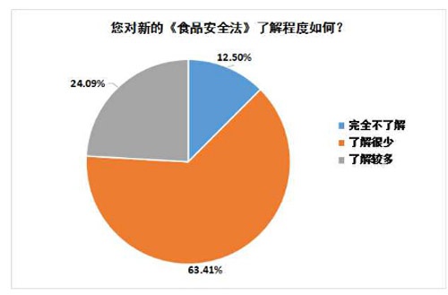 2015年10月1日,新修訂的《食品安全法》正式實施。那么,廣大消費者對這一涉及切身利益的法律武器了解程度如何呢?對于新的《食品安全法》,消費者最關(guān)心的又是什么呢?調(diào)查結(jié)果讓人大跌眼鏡,竟有63.41%的被調(diào)查者表示對新的《食品安全法》了解很少,甚至有12.50%的消費者完全不了解。這就要求進一步加強新《食品安全法》的宣傳普及工作,擴大這一法律的社會認知度,使其家喻戶曉、深入人心。