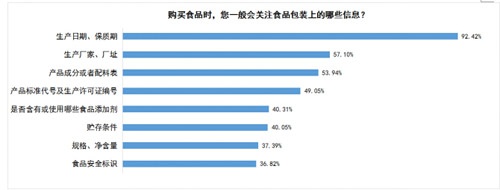 在被調(diào)查者的消費習(xí)慣上,調(diào)查顯示,44.37%的消費者在購買食品之前會查看包裝標簽及說明,但看得并不仔細;同時有1.53%的消費者根本不看。在“消費者關(guān)注食品包裝上的哪些信息”中,92.42%的消費者表示會關(guān)注食品的生產(chǎn)日期和保質(zhì)期,而有四成多的消費者卻不關(guān)注食品的生產(chǎn)廠家、廠址及產(chǎn)品成分等信息;還有六成左右的消費者不關(guān)注食品添加劑、貯存條件、規(guī)格、凈含量及食品安全標識等信息。這說明很多消費者還須不斷提高食品安全意識,確保自身消費安全。
