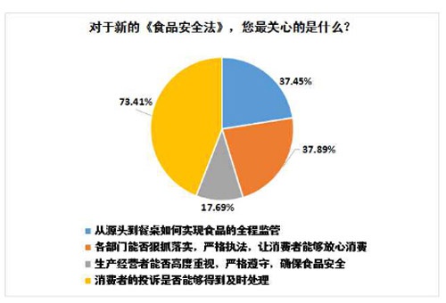 而對于新的《食品安全法》,73.41%的消費者最關(guān)心的問題是消費者的投訴能否得到及時處理,37.45% 的消費者關(guān)心從源頭到餐桌如何實現(xiàn)食品的全程監(jiān)管,37.89%的消費者關(guān)心各部門能否狠抓落實,嚴格執(zhí)法,讓消費者能夠放心消費。