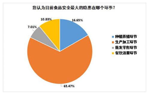 從食品安全問題產(chǎn)生的環(huán)節(jié)來看,65.47%的消費者認為食品的生產(chǎn)加工環(huán)節(jié)最容易出現(xiàn)安全隱患,16.65% 的消費者則將原因歸咎于種植養(yǎng)殖環(huán)節(jié);另外,分別有10.83%和7.01%的消費者認為餐飲消費環(huán)節(jié)和批發(fā)零售環(huán)節(jié)最容易出現(xiàn)問題。這說明多數(shù)消費者對食品的生產(chǎn)加工環(huán)節(jié)是否安全、衛(wèi)生非常擔憂,相關(guān)部門也應(yīng)加大對這一環(huán)節(jié)的監(jiān)管以及處罰力度。