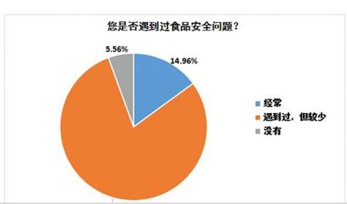由40省市消協(xié)組織與中國消費者報社、中國消費網(wǎng)聯(lián)合開展的此次調(diào)查結(jié)果顯示,79.46%的消費者表示對食品安全問題“遇到過,但較少”,另有14.96%的消費者則表示經(jīng)常遇到,僅有 5.56% 的消費者表示還未遇到過此類問題。