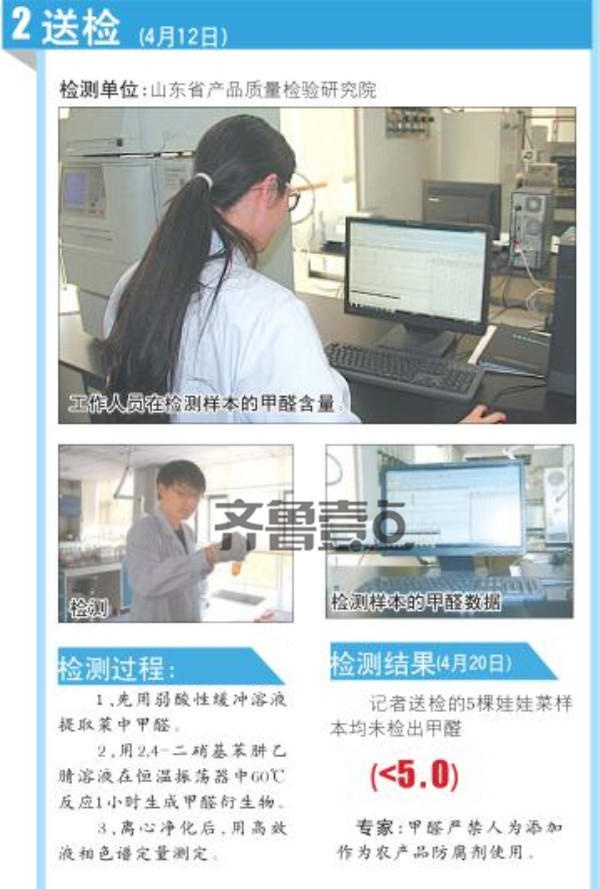 記者分別從蔬菜批發(fā)市場、大型超市、小區(qū)菜市場采集娃娃菜樣本,并送到山東省產品質量檢驗研究院檢測,結果顯示甲醛指標<5.0,未達到機器檢驗值,也就是說這5種娃娃菜樣本均未檢出甲醛。