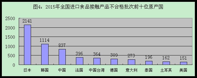 從不合格產(chǎn)品原產(chǎn)國(guó)分布情況來(lái)看,2015年度進(jìn)口食品接觸產(chǎn)品不合格批次原產(chǎn)國(guó)(或地區(qū))前十位依次是日本、韓國(guó)、中國(guó)(出口復(fù)進(jìn)口)、法國(guó)、中國(guó)臺(tái)灣、德國(guó)、意大利、泰國(guó)、土耳其、美國(guó),原產(chǎn)上述十國(guó)(或地區(qū))的不合格批次合計(jì)5943批(見圖4),占不合格總批次的71.3%,其中原產(chǎn)日本、韓國(guó)的不合格批次占總不合格批次的39.1%。