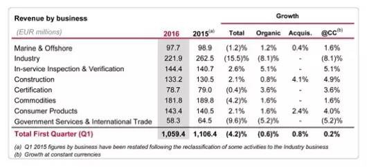 從報表看,必維第一季度收入排在前列的領域(營收過億歐元)分別是:工業(yè)、商品、在線檢測與認證、消費品、建筑。