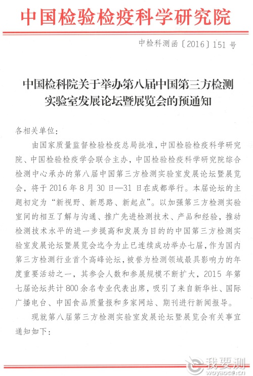 由國(guó)家質(zhì)量監(jiān)督檢驗(yàn)檢疫總局批準(zhǔn),中國(guó)檢驗(yàn)檢疫科學(xué)研究院、中國(guó)檢驗(yàn)檢疫學(xué)會(huì)聯(lián)合主辦,中國(guó)檢驗(yàn)檢疫科學(xué)研究院綜合檢測(cè)中心承辦的第八屆中國(guó)第三方檢測(cè)實(shí)驗(yàn)室發(fā)展論壇暨展覽會(huì),將于2016年8月30日—31日在成都舉行。
