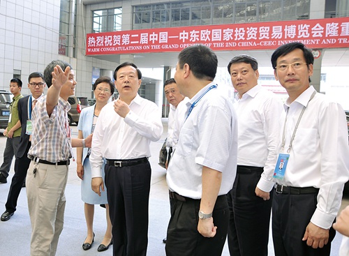 浙江省委書記夏寶龍(左五)在浙洽會(huì)現(xiàn)場(chǎng)聽取省質(zhì)監(jiān)局副局長(zhǎng)做“浙江制造”品牌標(biāo)識(shí)說(shuō)明。