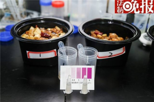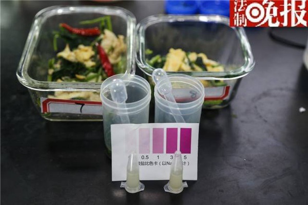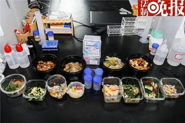 《法制晚報(bào)》記者在7月27日晚和28日上午,分別自制了3份對照樣品炒菜及一份沙拉,并從飯店訂購了兩個(gè)對照樣品的炒菜(27日的炒菜樣品均放置于冰箱儲存),并將6個(gè)對照組的炒菜樣品送經(jīng)北京智云達(dá)食品安全檢測中心檢測。