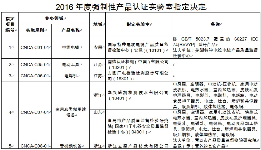 國家認(rèn)監(jiān)委2016年第21號公告《國家認(rèn)監(jiān)委關(guān)于發(fā)布2016年度強制性產(chǎn)品認(rèn)證實驗室指定決定的公告》