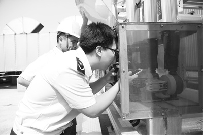 圖為執(zhí)法人員在檢查VOCs治理設(shè)備運行情況
