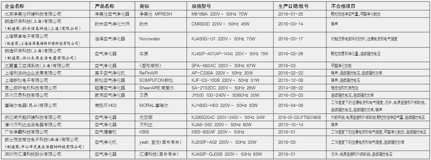 空氣凈化器2016國(guó)抽不合格產(chǎn)品名單