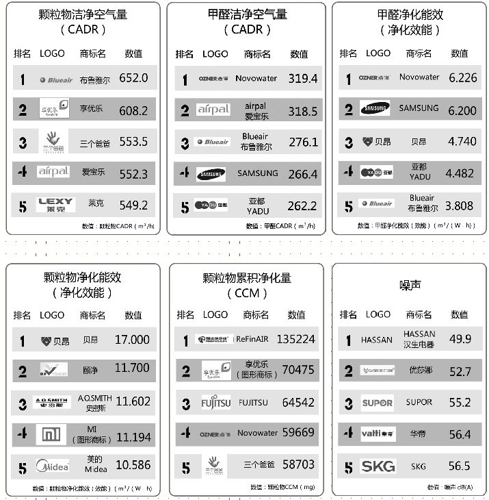 國(guó)家標(biāo)準(zhǔn)GB/T 18801-2015《空氣凈化器》規(guī)定的性能指標(biāo)基本涵蓋了凈化器所有使用功能,可總結(jié)為九大指標(biāo):潔凈空氣量(簡(jiǎn)稱CADR)、凈化能效、噪聲、適用面積、累積凈化量(簡(jiǎn)稱CCM)、凈化壽命、待機(jī)功率、有害物質(zhì)釋放量、微生物去除(抗菌、防霉、除菌)。