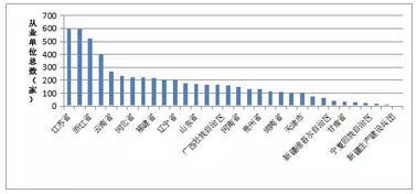 從從業(yè)單位數(shù)量看,江蘇省、廣東省、浙江省均超過500家。三省分別占從業(yè)單位總數(shù)的10.54%、10.47%和9.23%,形成第一集團(tuán),重慶市作為第二集團(tuán)的排頭以近7%的占比緊隨其后,包括青海省、甘肅省在內(nèi)的7個(gè)地區(qū),其占比分別均不足1%。環(huán)境服務(wù)業(yè)從業(yè)單位地域分布如圖12所示。