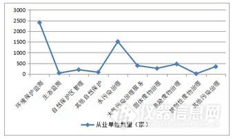 從從業(yè)人員看,環(huán)境治理業(yè)從業(yè)人數(shù)以超總?cè)藬?shù)的60%居于首位。環(huán)境與生態(tài)監(jiān)測領(lǐng)域以吸引近11萬人從業(yè)而位居次席。從事生態(tài)保護(hù)的人員不足1.4萬人。