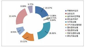 水污染治理、危險(xiǎn)廢物治理和環(huán)境保護(hù)監(jiān)測位列細(xì)分領(lǐng)域年收入三甲,分別超過600億元、500億元和400億元。各領(lǐng)域年收入占比如圖2所示。