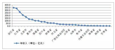從企業(yè)盈利水平看,廣東省、北京市、江蘇省、上海市、浙江省的企業(yè)營業(yè)利潤額位居全國前列,僅廣東省一地的營業(yè)利潤就達(dá)營業(yè)利潤總額的近17%,尾隨其后的北京市也以近22億元的營業(yè)利潤超過總額的13%,甘肅省、新疆維吾爾自治區(qū)、內(nèi)蒙古自治區(qū)、寧夏回族自治區(qū)和廣西壯族自治區(qū)的年?duì)I業(yè)利潤均為負(fù)值,顯示虧損。