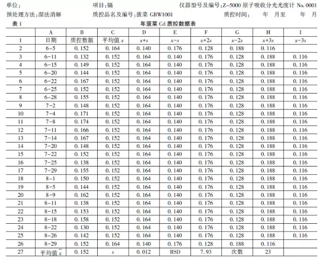 新建Excel表,見表1所列,按日期、質(zhì)控樣測定數(shù)據(jù)、平均值