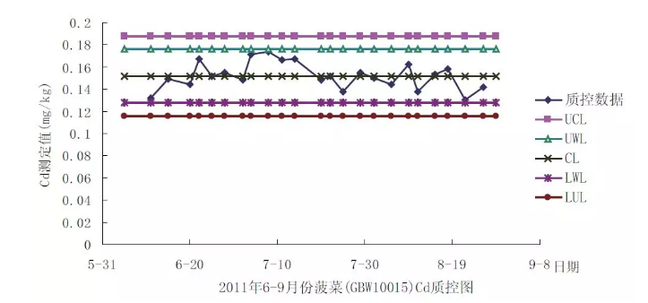 在分析某一項目時,把質(zhì)控樣在不同日期按照與分析實測樣品相同進行分析,每次至少平行分析兩次。分析結(jié)果的相對相差符合要求者保留,否則報廢重新進行分析。當控制樣的結(jié)果累積達20次以上時,計算均值及標準偏差,進行控制樣質(zhì)控圖的建立。