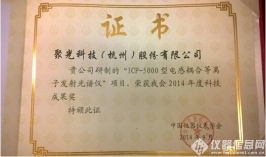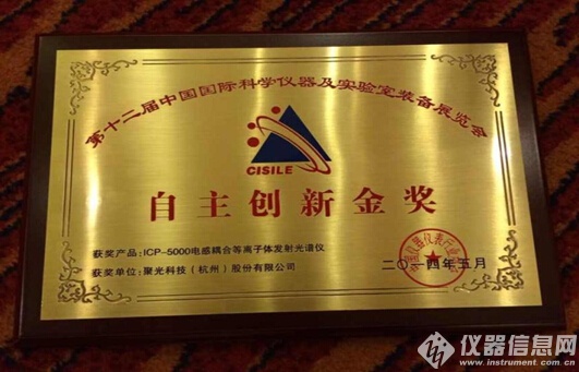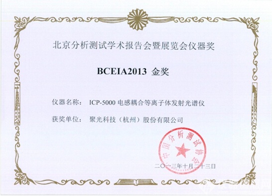 ICP-5000在2013年5月14日舉辦的中國分析測試協(xié)會(huì)的專家鑒定會(huì)上,得到了專家們的一致認(rèn)可,均稱贊此產(chǎn)品已經(jīng)達(dá)到國際同類產(chǎn)品先進(jìn)水平,在2013年10月舉辦的BECIA展會(huì)和2014年5月舉辦的CISILE展會(huì)均得到金獎(jiǎng),在2014年9月MICONEX展會(huì)上,獲得科技成果獎(jiǎng);