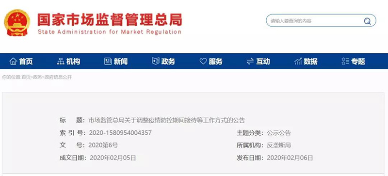 市場監(jiān)管總局關(guān)于調(diào)整疫情防控期間接待等工作方式的公告